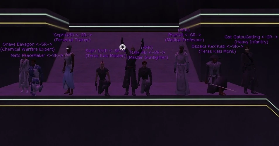 The group that would later be named -SR- started in the imperial guild ONE. After the game had been out for a few months and PVP was in full force, a very outgoing and vocal member of ONE named Nato created what he referred to as "The Elite Team". The Elite Team was a group of people within ONE that were recognized for having above average combat skills and could handle themselves in nearly any combat situation they would have to face. This group of people swore to protect Mos Eno from attacks and be willing to help the guild in any way they could.
