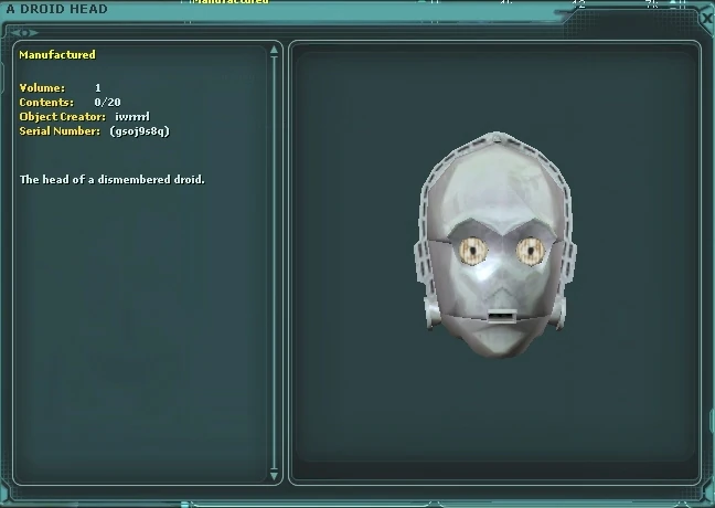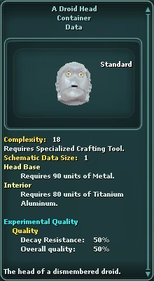 A Droid Head is a type of furniture found as engineering schematic loot. A Droid Head is listed on Bazaar Terminals under Misc » Container. Droid Head Draft Schematic is listed on Bazaar Terminals under Misc » Generic Item.