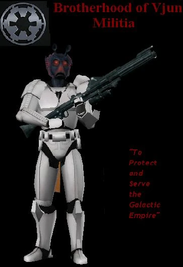 The planet of Vjun had fallen under Imperial control as Lord Vader placed his personal citadel there. Vjun was known for its force sensitive population. Vader quickly began rounding up the force sensitive of Vjun, he foresaw them being problematic. Vader gave the force sensitive of Vjun an ultimatum, join him and serve the Empire or be destroyed. The force sensitive of Vjun fought valiantly against Vader and his forces. They were no match for Vader and the Empire many sons of Vjun fell. The force sensitive who survived fled to Talus, to hide and gather their strength to strike back against Vader. These force sensitive became known as The Brotherhood of Vjun, as they waged their bloody guerilla war against Vader and his Imperial forces on Vjun, they took notice of the Brotherhoods crusade. They agreed to provide weapons, supplies, and ships to the Brotherhood in return for their assistance against the Empire. When the war began it simply was to depose Vader and his forces from Vjun. It took on a life of its own, sons and daughters of Vjun of all professions and walks of life have pledged themselves to The Brotherhood of Vjun.