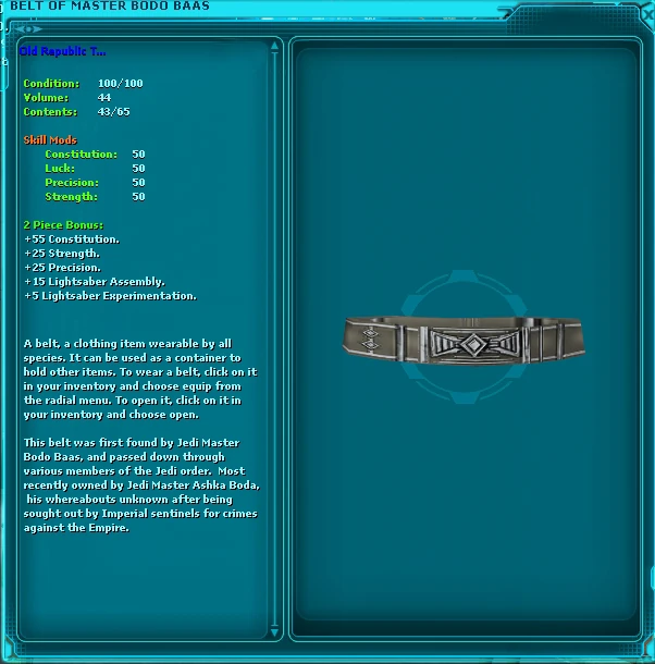Belt of Master Bodo Baas is a clothing item wearable by all species. It can be used as a container to hold 65 items and cannot be worn at the same time as another wearable container, such as a backpack or mercenary pilot bandolier. It is rewarded upon completion of Jedi Artifact Collection - Waist Pack.