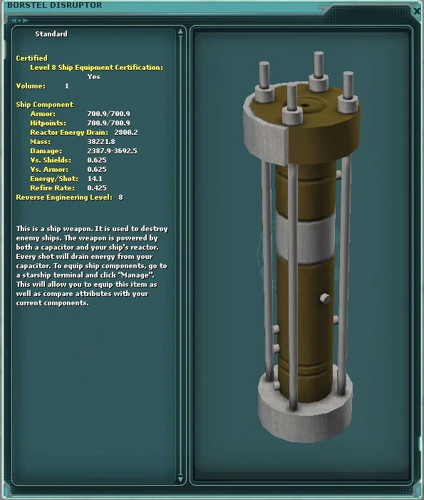 This level 8 weapon is one of the most wanted in game due to its extremely good stats. The Incom "Tri-Cannon" has exactly same stats but is a Rebel Reward. Both of these powerful weapons are most notable for having some of the highest damage of any level 8 gun. It is admitted that no level 8 Re-engineering project is complete without at least a Borstel or Tri-cannon.