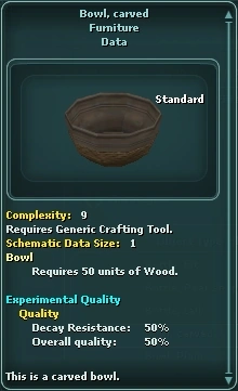 Bowl, carved is decorative art furniture found as domestic schematic loot. Bowl, carved is listed on Bazaar Terminals under Misc » Furniture. Carved Bowl Draft Schematic is listed on Bazaar Terminals under Misc » Generic Item.
