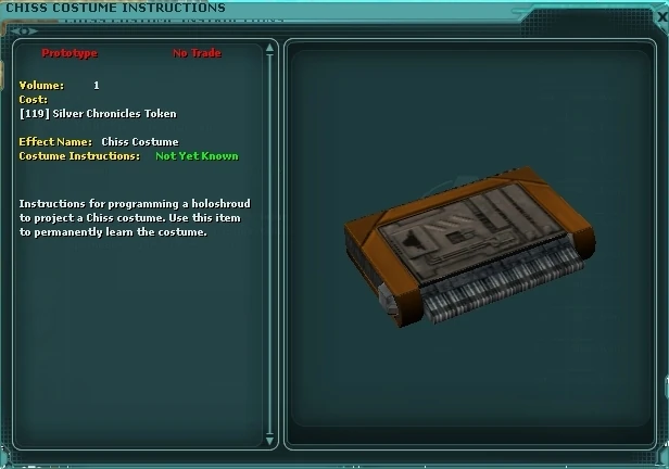Use this item to permanently learn how to use a holoshroud to project a Chiss Costume.