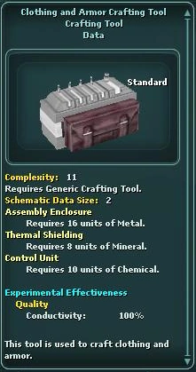 Clothing and Armor Crafting Tool is a type of crafting tool used to craft clothing and armor. It is required for schematics that have a complexity higher than 15. Schematics with a complexity higher than 20 also require a Clothing and Armor Crafting Station or droid with a Clothing Droid Crafting Station Module.