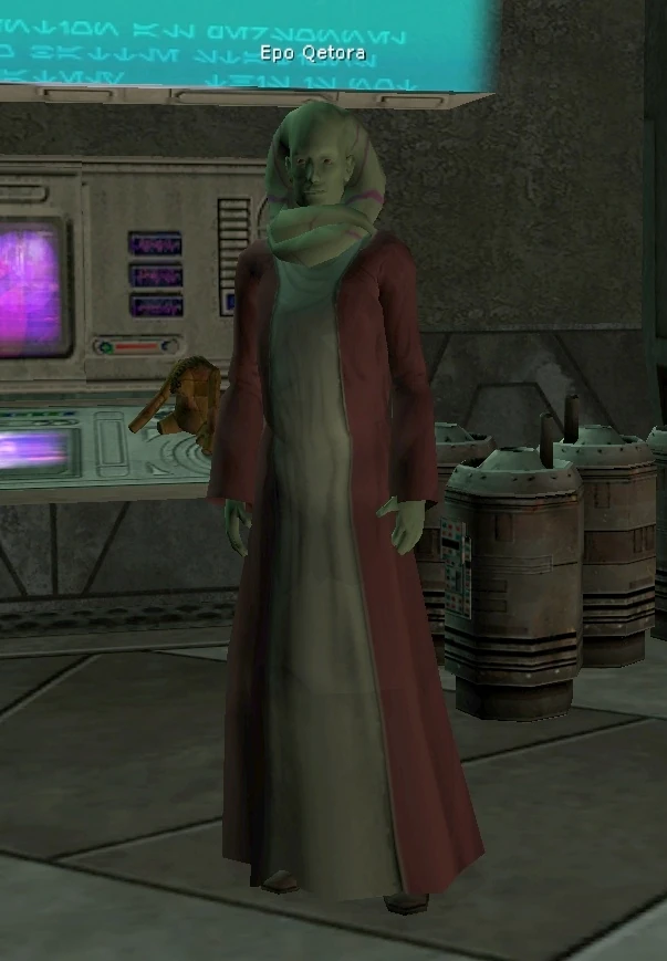 Epo Qetora is a Twi'lek historian located in the Mensix Mining Facility on Mustafar. He starts the quest "A History Lesson."