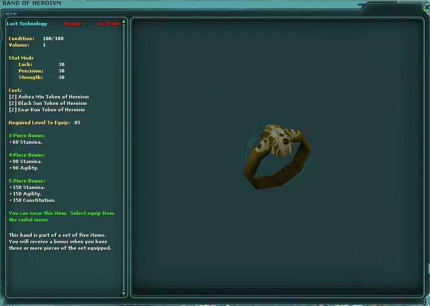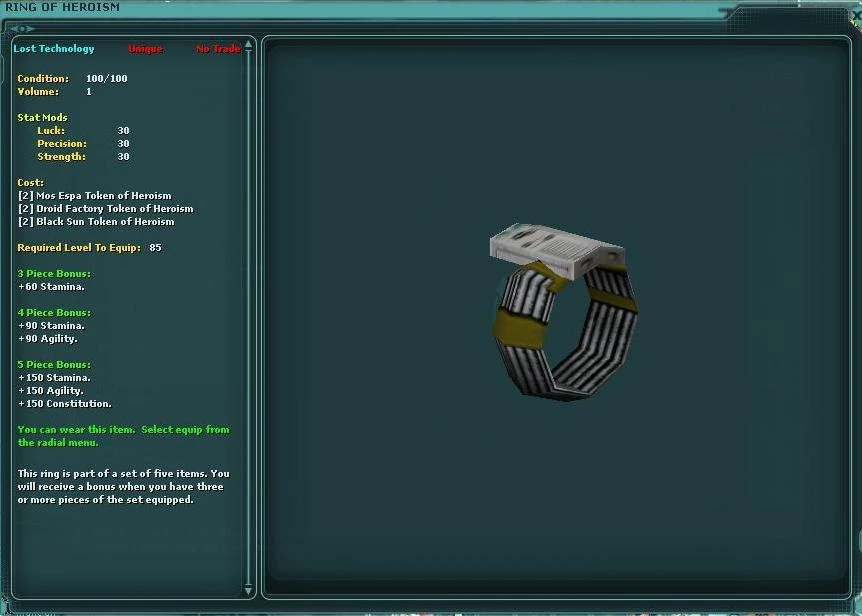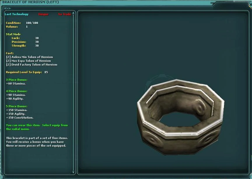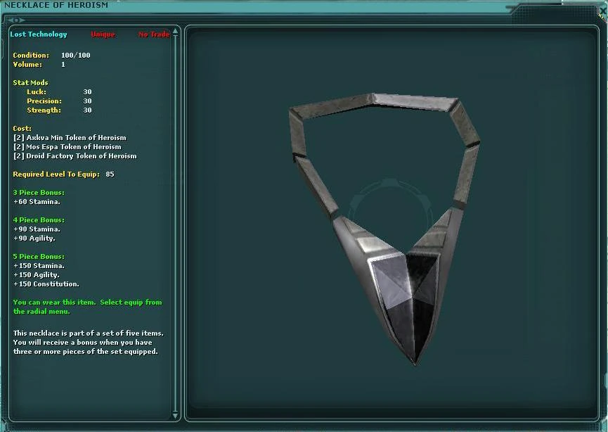 There is 1 necklace, 2 bracelets and 2 rings in a set. The set is popular not only due to the fact that the pieces had no-trade removed, but also because of the fact there is no profession restriction on the jewelry pieces; this means both Entertainers and Traders can utilise the sets and benefit from the bonuses offered.