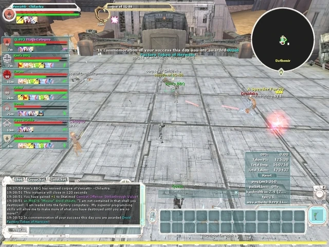 At the end of the first phase, CL90 Gold Boss Droidekas will spawn in place of the Battle Droids. There will be four of these initially. The Jedi and Bounty Hunters blocking the doors immediately aggro the Droidekas and drag them to the center of the factory area, where the remainder of the group is waiting. In the alternative, have everyone go to one of the doors and attack the droideka at that door and then rotate around the room killing the other three with everyone attacking the same droideka at all times.