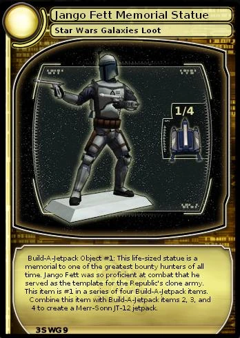 When this TCG loot card is redeemed you receive a memorial statue of Jango Fett. Combine this item with Merr-Sonn JT-12 Jetpack Blueprints, Boba Fett Statue and a Mandalorian Skull Banner to create a Merr-Sonn JT-12 jetpack.