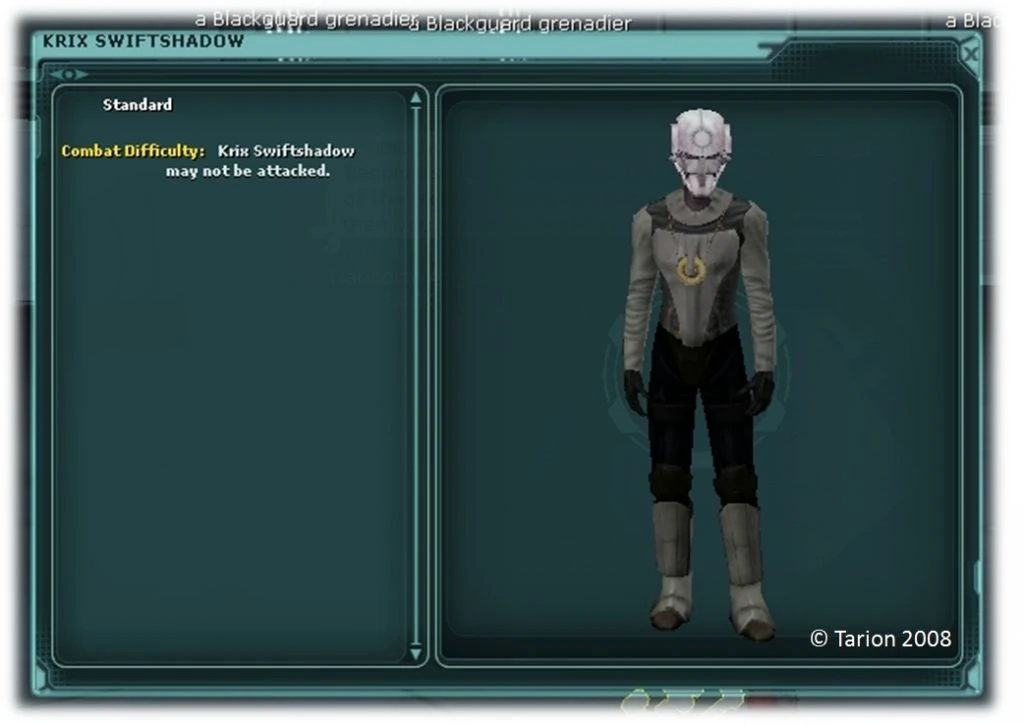You than can move to the next room where you'll meet 3 engineers, kill them and wait in the room. Ask again the Jedi to pull the blacksun boarder to your room and kill them.