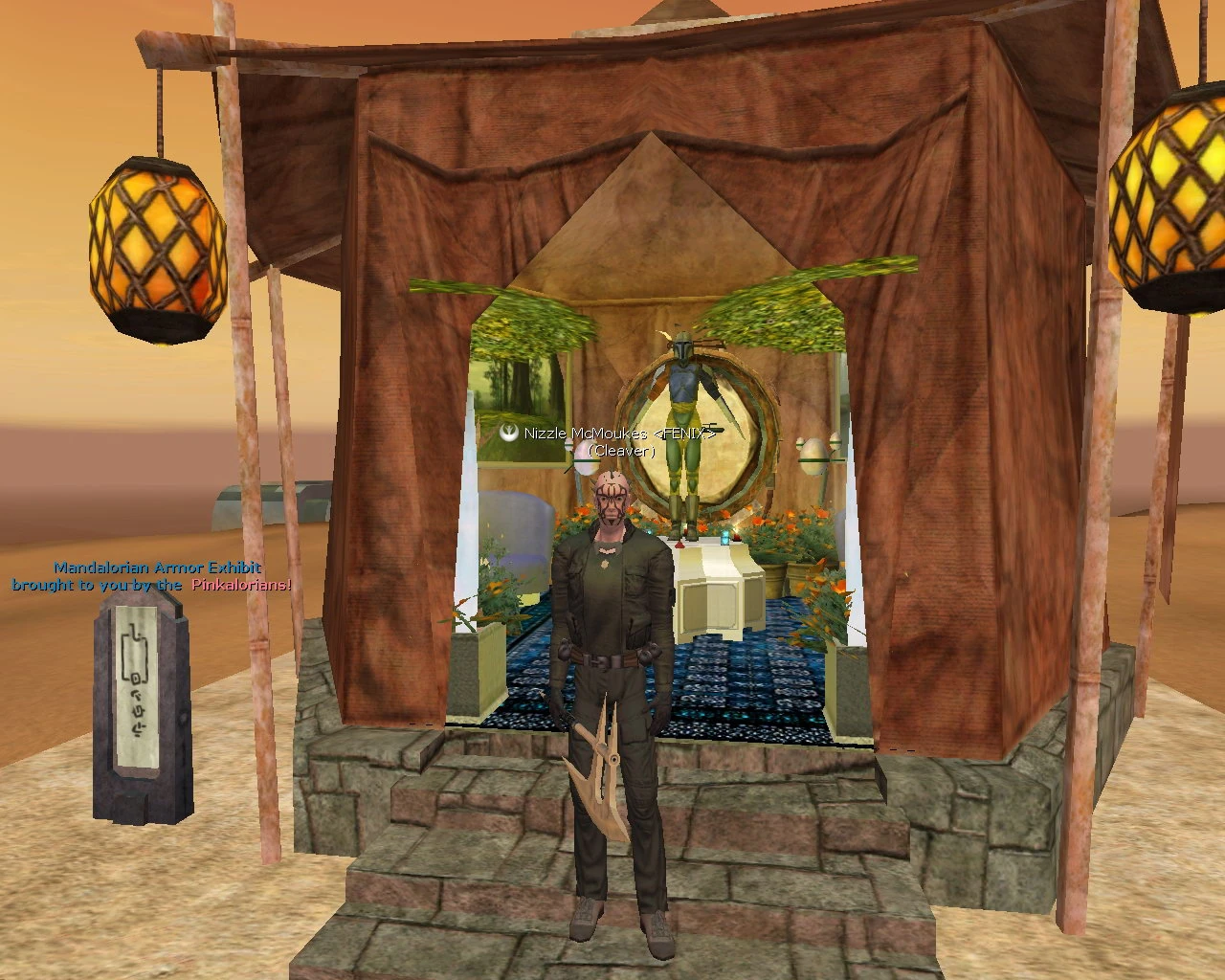The first piece of Mandalorian ever was a Helmet crafted by The roughnecks on Test Center. The first chest plate was crafted by Ludossk on Eclipse. The first full set was completed on Corbantis by a group of players known as the Pinkalorians. In order to make sockets on all pieces, the traders who make the pieces must have their Armor Assembly over 150. This is achieved with Armor Assembly Mods on shirt, chestplate and weapon that the trader must wear and also 3 Armor Assembly powerups of the 3 types, clothing, weapon, and armor.