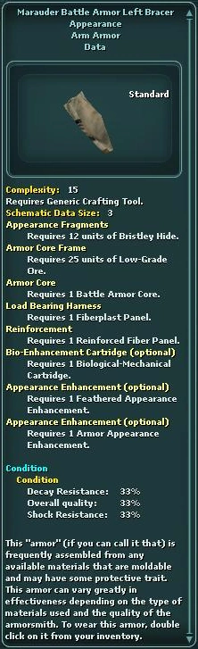 Marauder battle armor is "battle armor" (if you can call it that) frequently assembled from any available materials that are moldable and may have some protective trait. This armor can vary greatly in effectiveness depending on the type of materials used and the quality of the armorsmith.