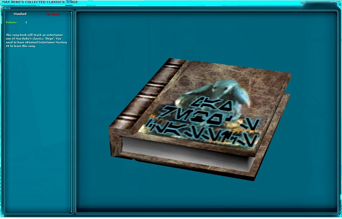 This song book will teach an entertainer one of Max Rebo's classics, 'Dirge'. You need to have obtained Entertainer Mastery IV to learn this song.