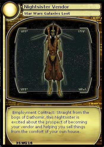 Description: Employment Contract: Straight from the bogs of Dathomir, this Nightsister is excited about the prospect of becoming your vendor and helping you sell things from the comfort of your own house.