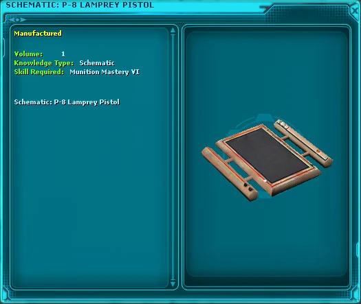 P-8 Lamprey Pistol is a type of pistol crafted by a munitions trader. The schematic can be found as loot from Grand Admiral Sait in the Lost Star Destroyer instance.