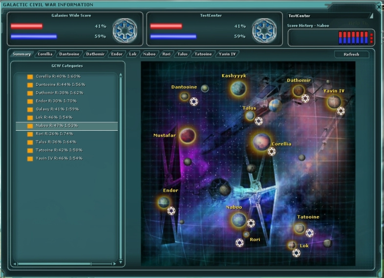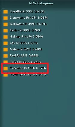 - /gcwinfo opens the User interface for the Galactic Civil War Information. This will allow you to see the percentage values of each faction from the regional scale, up to a complete cross server leader board.
