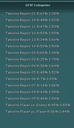 The entirety of a planet's surface is divided up into regions. These regions are shown on the Planetary Map and are either centered around a major NPC city or a Point of interest. Each planet also contains: one "extra" region that comprises of all of the space that does not fit into any other region; a "space" region that encompasses all of the planet's space sector; and PvP, PvE and Battlefield scores. The control of these regions is shown in a pane to the left of the GCW information window as "percentage control". Using the Hyperspace map will also show an icon representing control of the "space" region. These percentage controls are calculated as follows: