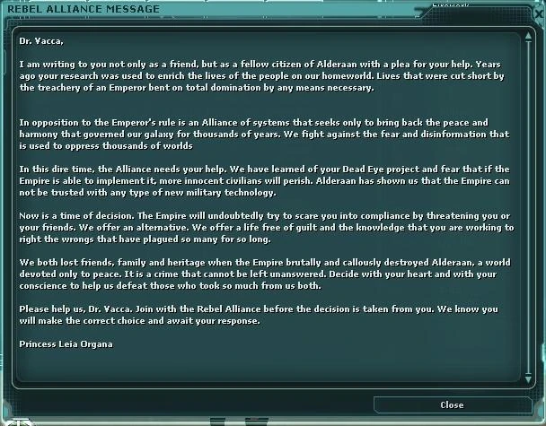 A No-Trade disk given by a rebel Commander during the Vacca's Allegiance quest, within the Cries of Alderaan Story Arc.