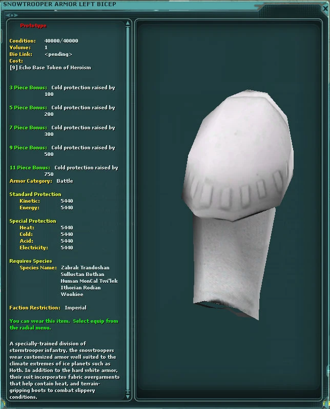 Purchased in Aurilia from the Imperial Snowtrooper for 9x Echo Base Token of Heroism tokens