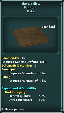 Throw Pillow is decorative art furniture found as domestic schematic loot. Throw Pillow is listed on Bazaar Terminals under Misc » Furniture. Throwpillow Draft Schematic is listed on Bazaar Terminals under Misc » Generic Item.