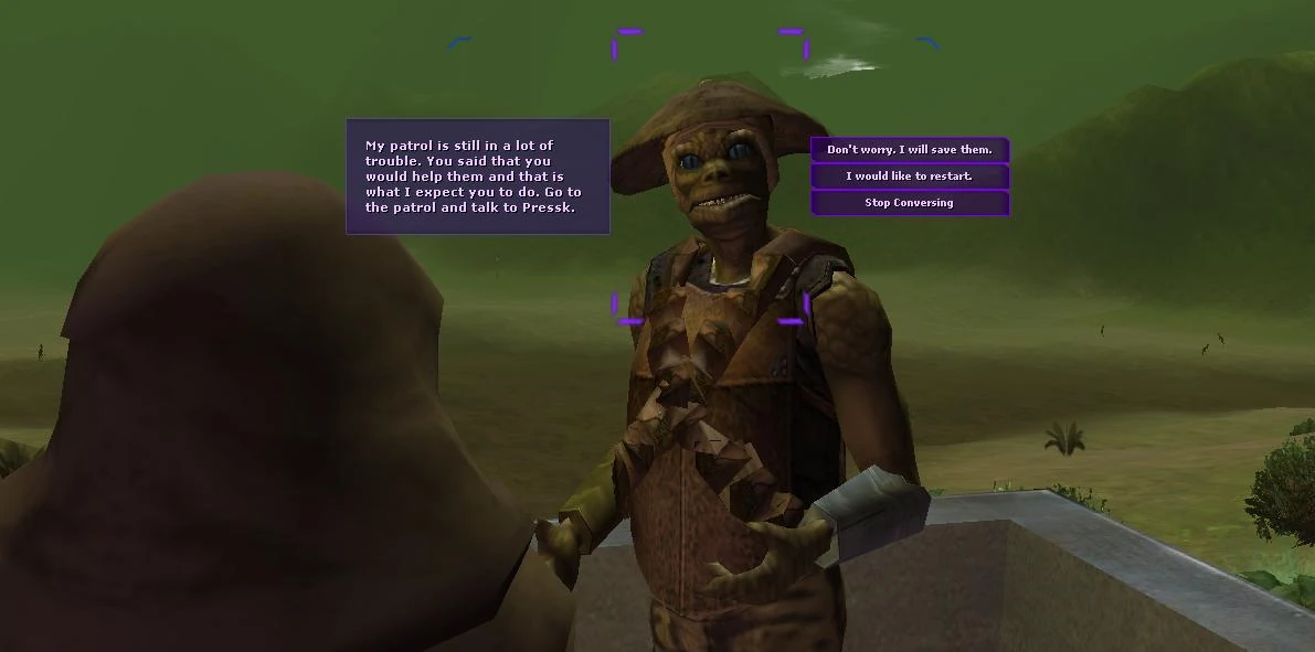 Head to the westernmost of the POI Trandoshian Slaver Camps in Kachirho. Talk to Ssiksik (/wp 208 109). He tells you that one of his slave patrols was jumped by Wookiees from the resistance, and he needs someone to go out and rescue his patrol, as they are pinned down under fire. Meet the Trandoshian slavers at their last reported point and talk to Pressk (-93 98).