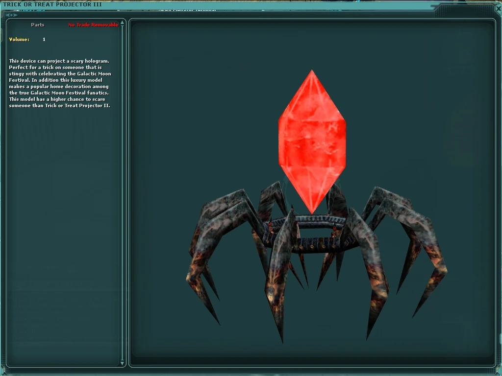 When dropped in a structure, this device can project a scary hologram. Perfect for a trick on someone that is stingy with celebrating the Galactic Moon Festival. In addition, this luxury model makes a popular home decoration among the true Galactic Moon Festival fanatics. This model has a higher chance to scare someone than Trick or Treat Projector II.
