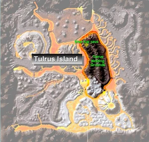 The Tulrus Nesting Grounds are the domain of the large and dangerous tulrus. There are only two other creatures who seem to fair very well on the island, one is the vicious jundak and the other is the Sher Kar, which uses the large tulrus as a steady supply of fresh game.