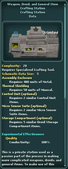Weapon, Droid, and General Item Crafting Station is a private crafting station used as a passive part of the process in making more complicated weapons, droids, and general items.