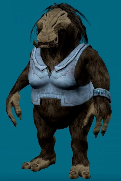 Clans of nomadic Whiphids roam the icy plains of Toola, following wandering herds of caraboose and hoary mastmots across the tundra. The shaggy aliens are well suited to such frigid environments, with thick coats of fur and fat to retain their body heat. Whiphids are powerful swimmers, and their fur sheds water, allowing them to swim freely in the cold seas. The greatest of Whiphids stand two-and-a-half meters tall, and weigh over 400 kilograms.