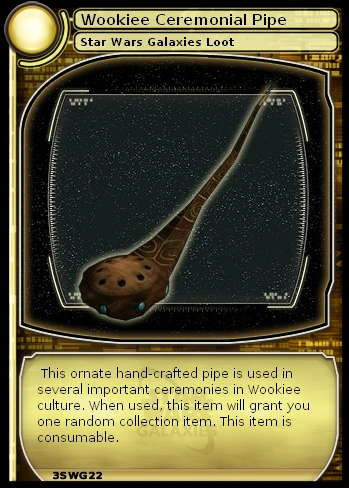 This ornate hand-crafted pipe is used in several important ceremonies in Wookiee culture. When used, this item will grant you one random collection item. This item is consumable.